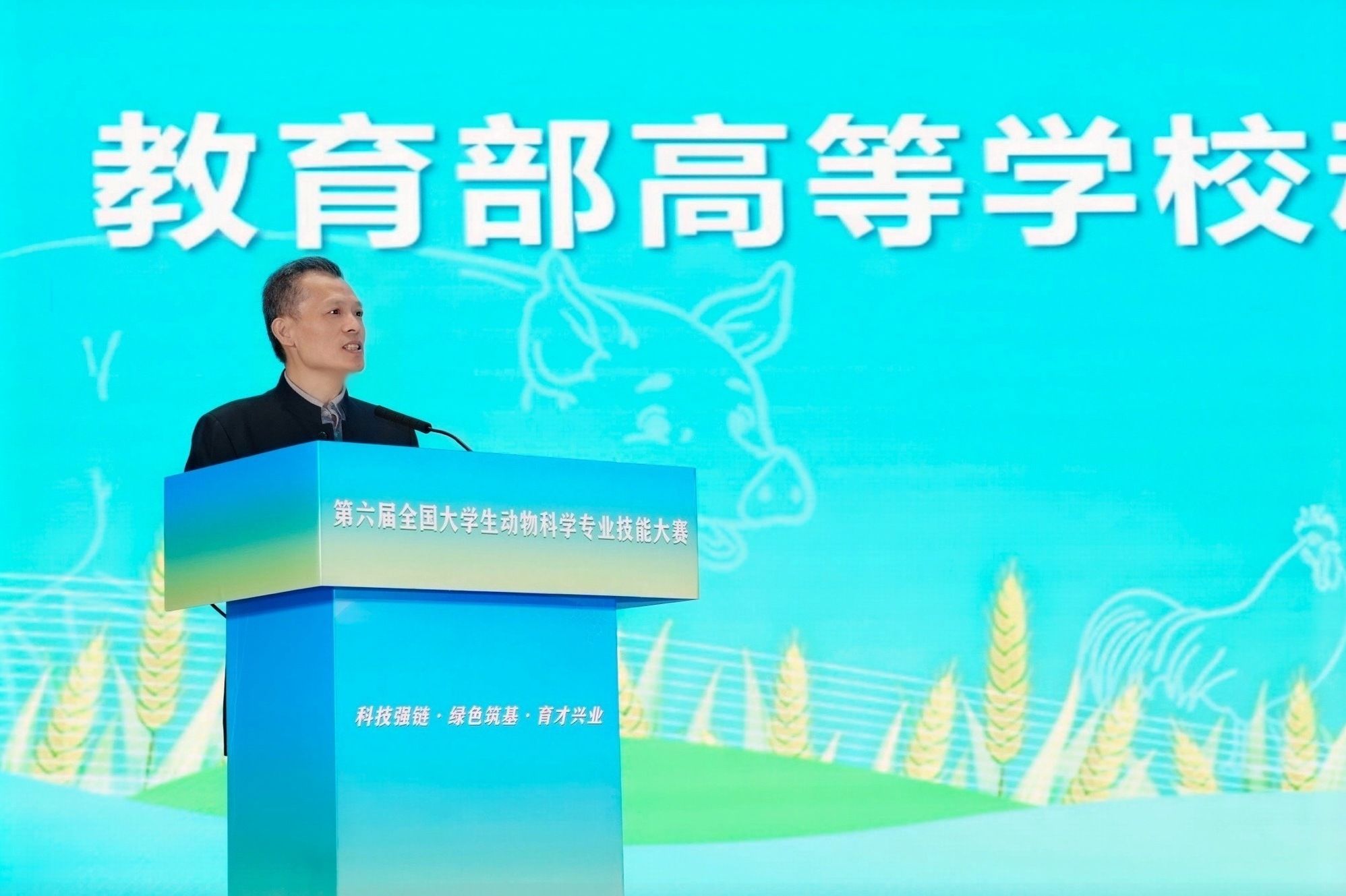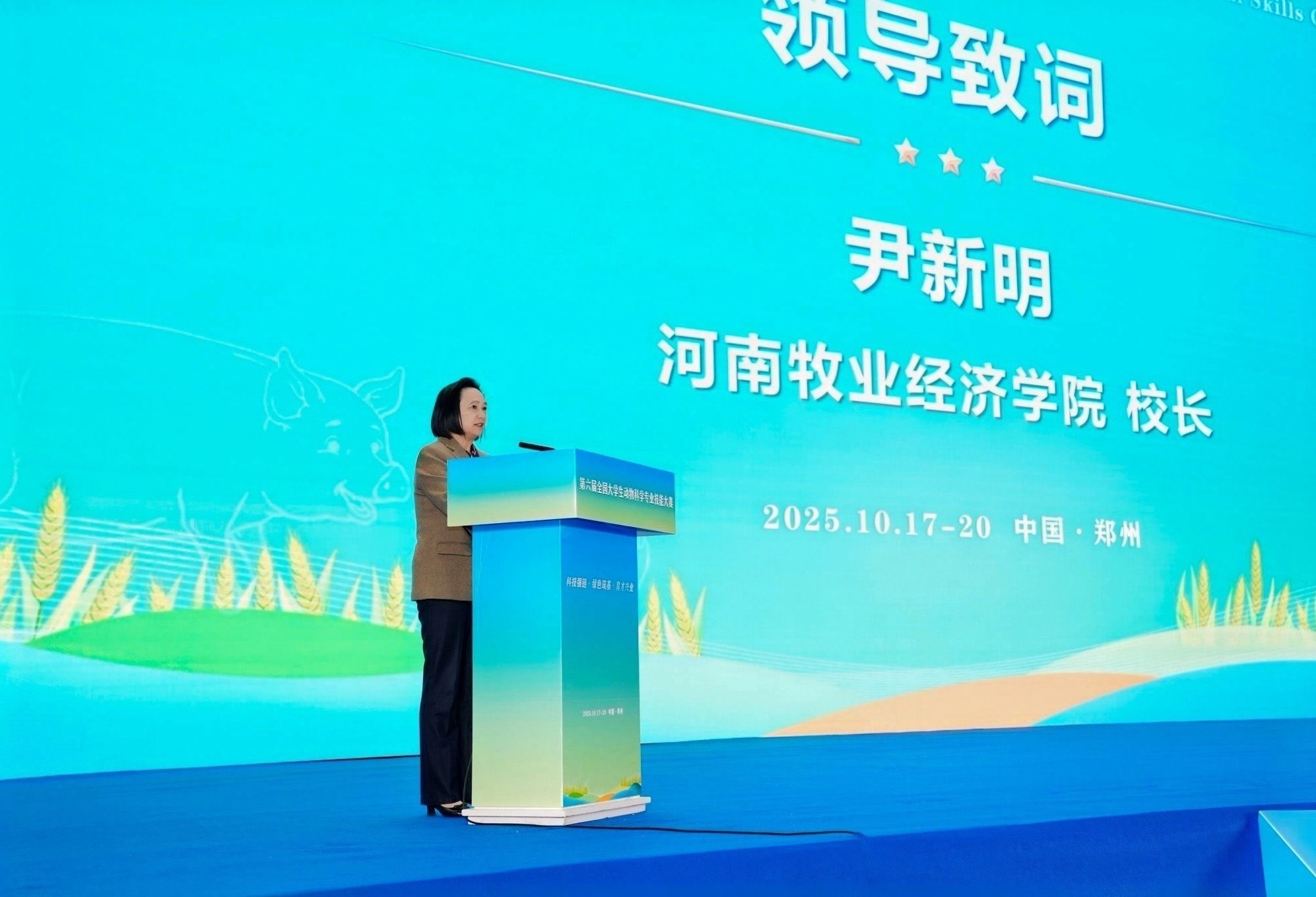 尹新明在开幕式致辞中对莅临本次大赛的各位领导、嘉宾、企业代表以及全体参赛师生表示热烈欢迎。她指出,我校始终坚持以立德树人为根本,以强农兴农为己任,坚持农科攀峰、工科强链、商科惟用,走牧工商一体化多学科交叉融合创新发展之路。动物科学专业是学校首批本科专业,培养了一大批奋战在教学、科研、生产第一线上的优秀人才,为河南省乃至中国畜牧业的蓬勃发展作出了卓越贡献。长期以来,学校高度重视实践育人工作,希望以本次大赛为平台,进一步加强参赛各方的交流与合作,营造全社会关心支持动物科学专业人才培养的良好氛围;希望以本次大赛为契机,加强产教融合,推动高校与社会力量的协同,把农业科技进步的前沿要求和产业发展的实际需求,始终贯穿在人才培养全过程;希望以本次大赛为引领,服务国家重大战略需求,共同推动畜牧学科高质量发展,为农业强省和教育强国贡献力量。