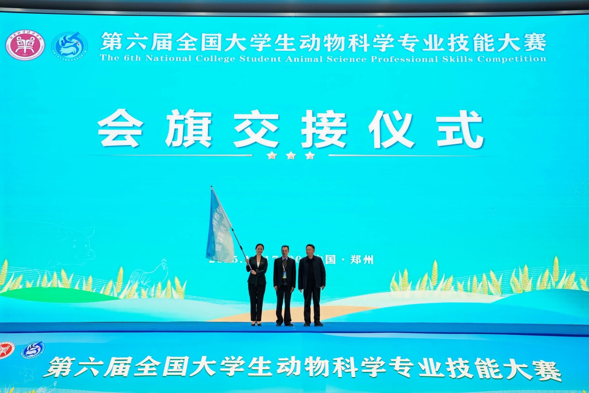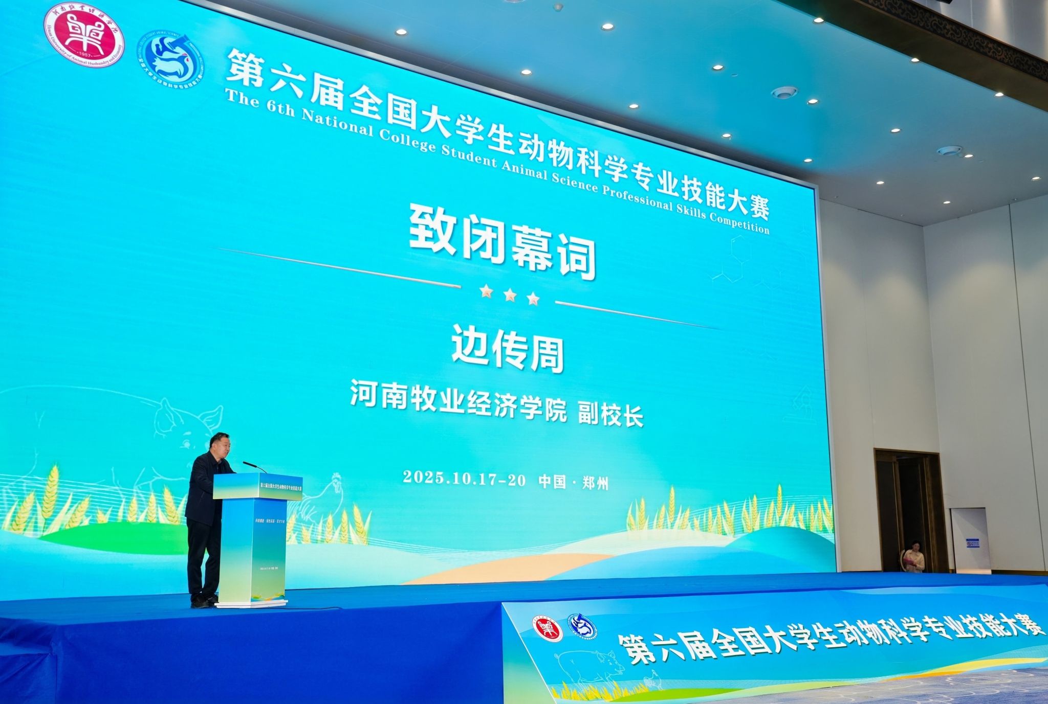 闭幕式上,边传周致辞。各项目裁判长分别点评和汇报项目比赛情况。与会领导嘉宾共同为获奖团体和个人颁奖。我校与第七届全国大学生动物科学专业技能大赛承办单位——湖南农业大学举行了会旗交接仪式。